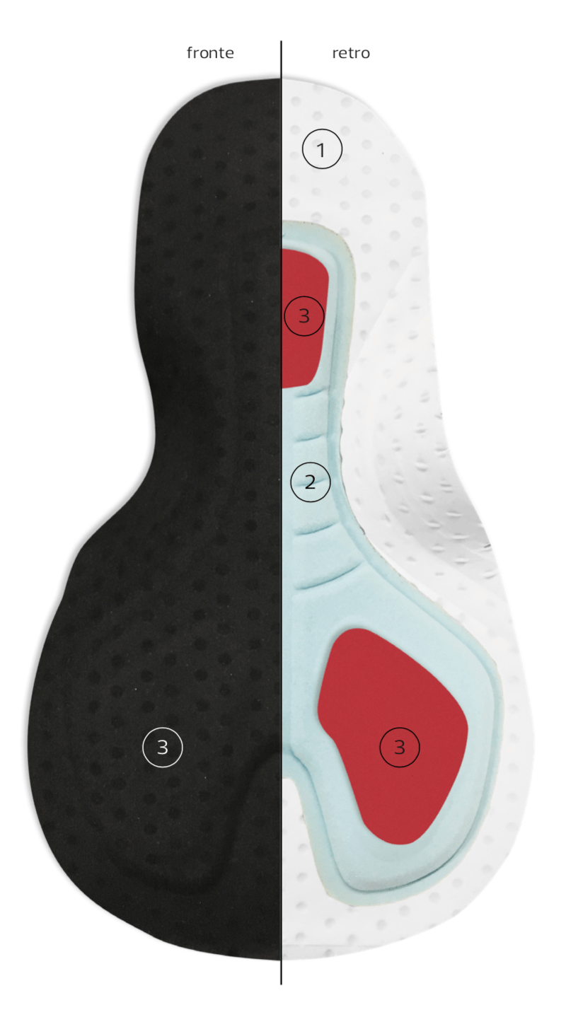 The second layer is designed following a careful study of movement: twisting, tilting, compression and extension are the typical movements of every cyclist. For this reason, we created various channels whose function is to facilitate movements, increasing comfort in the saddle 2.